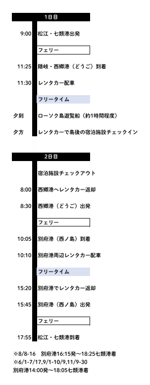 15:45 別府港(西ノ島)発 〜フェリー〜 17:55 七類港(松江)着