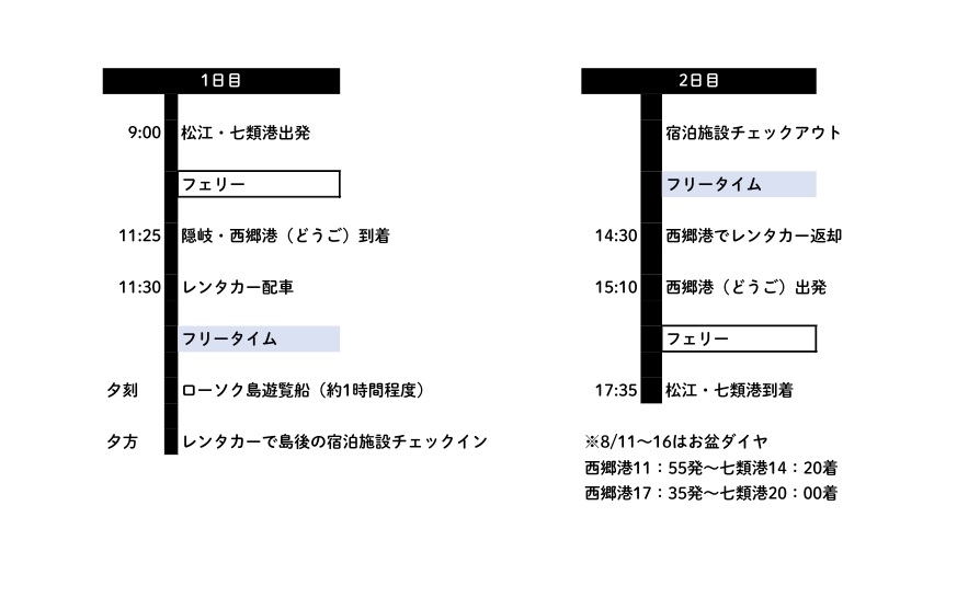 ▶ GW期間中のフェリー船内は大変混雑し、通路や船外デッキなどでお過ごしいただく状況もございます。フェリー1等以上の客室は定員が設けられており、お席に限りがございます。また高速船への変更も可能です。(※予約制、座席指定ではありません)どちらも、ご希望のお客様はオプショナルプランでお申し込みください。※満席になる場合もございますのでご了承ください。