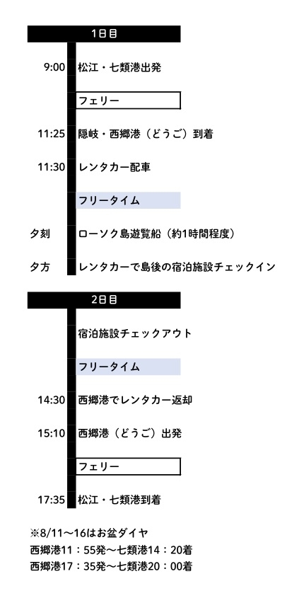 ▶ GW期間中のフェリー船内は大変混雑し、通路や船外デッキなどでお過ごしいただく状況もございます。フェリー1等以上の客室は定員が設けられており、お席に限りがございます。また高速船への変更も可能です。(※予約制、座席指定ではありません)どちらも、ご希望のお客様はオプショナルプランでお申し込みください。※満席になる場合もございますのでご了承ください。